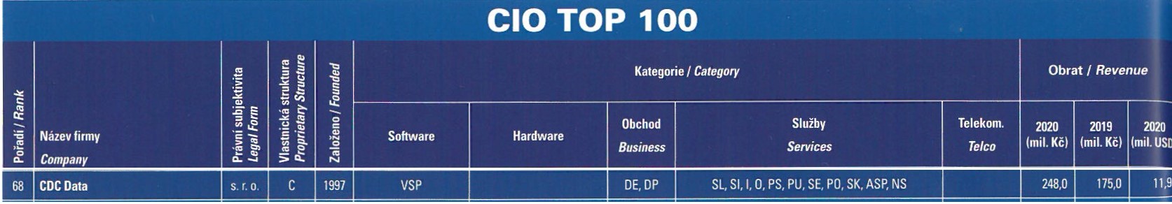 Nás v CDC velmi těší, že jsme se stali součástí tohoto hodnocení a obsadili jsme cennou 68. příčku. Pole informačních technologií je ale hodně široké a v žebříčku se nachází i společnosti odlišného zaměření, se kterými není srovnání relevantní. Pokud bychom se chtěli porovnávat pouze s našimi přímými konkurenty, troufáme si na umístění v TOP 20.