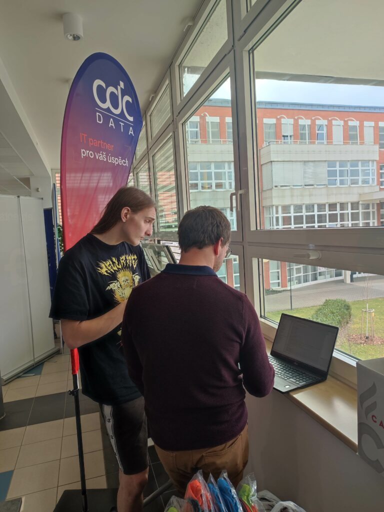 Během dne jsme u našeho stánku přivítali mnoho studentů, kteří se zajímali nejen o možnosti spolupráce, ale i o praktickou ukázku našeho programovacího prostředí. Naštěstí jsme s sebou měli kolegu programátora, který zájemcům názorně předvedl, jak vypadá jeho každodenní práce.