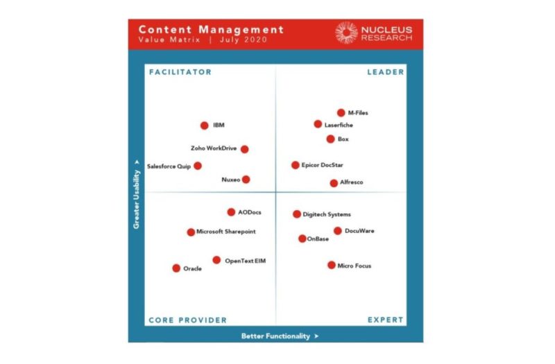Společnost M-Files dosáhla i v roce 2020 nejlepších hodnot mezi konkurenty v technologické matici Nucleus Research Content Management. Nucleus hodnotí dva klíčové faktory, funkčnost a použitelnost. M-Files získaly v obou oblastech nejvyšší hodnocení a staly se tak již po sedmé lídrem mezi dodavateli v oblasti správy obsahu.