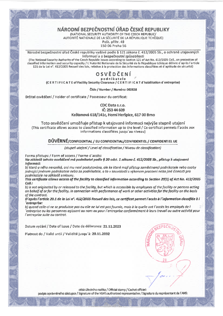Zjistit víceJsme nesmírně hrdí na to, že naše společnost prošla úspěšně prověrkou od Národního bezpečnostního úřadu (NBÚ) ČR a získala osvědčení na stupeň důvěrné. Toto osvědčení potvrzuje náš vysoký standard bezpečnosti a důvěrnosti při zpracování citlivých informací označených jako důvěrné. Představuje to nejen ocenění naší práce, ale také potvrzení, že jsme důvěryhodným partnerem pro zákazníky, jejichž data jsou označena statusem „důvěrné“.
