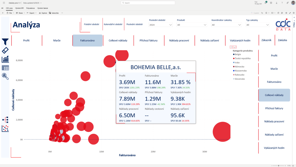- Poskytuje přehledné reporty a interaktivní dashboardy, které ukazují, jak si firma vede, kde jsou rezervy a jaké trendy se objevují. Všechna data se navíc aktualizují automaticky, takže rozhodujete podle aktuálních informací, nikoli podle zastaralých tabulek.